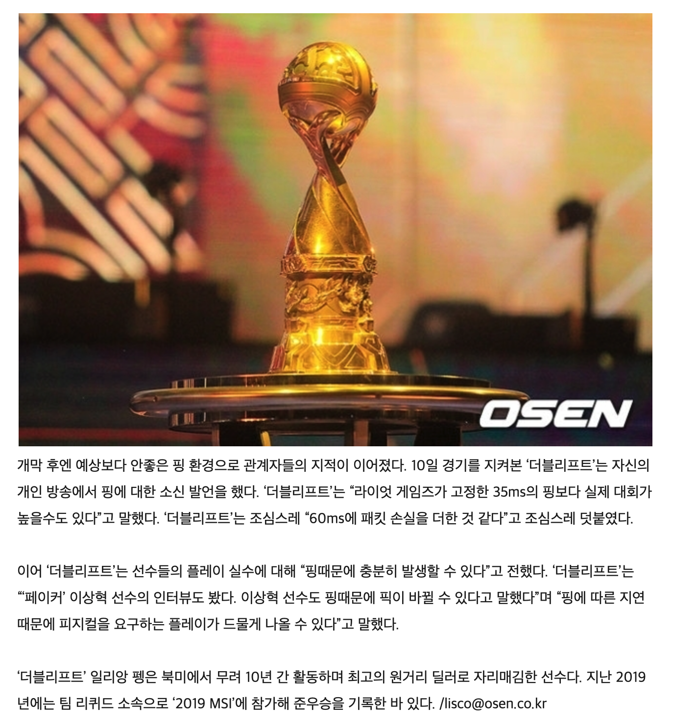 Doublelift在直播里表示:“实际的比赛可能会高于官方规定的 35ms ping。” 后续他也补充道,“据我从Tactical那里听说好像是60ms,甚至有丢包的情况出现。”