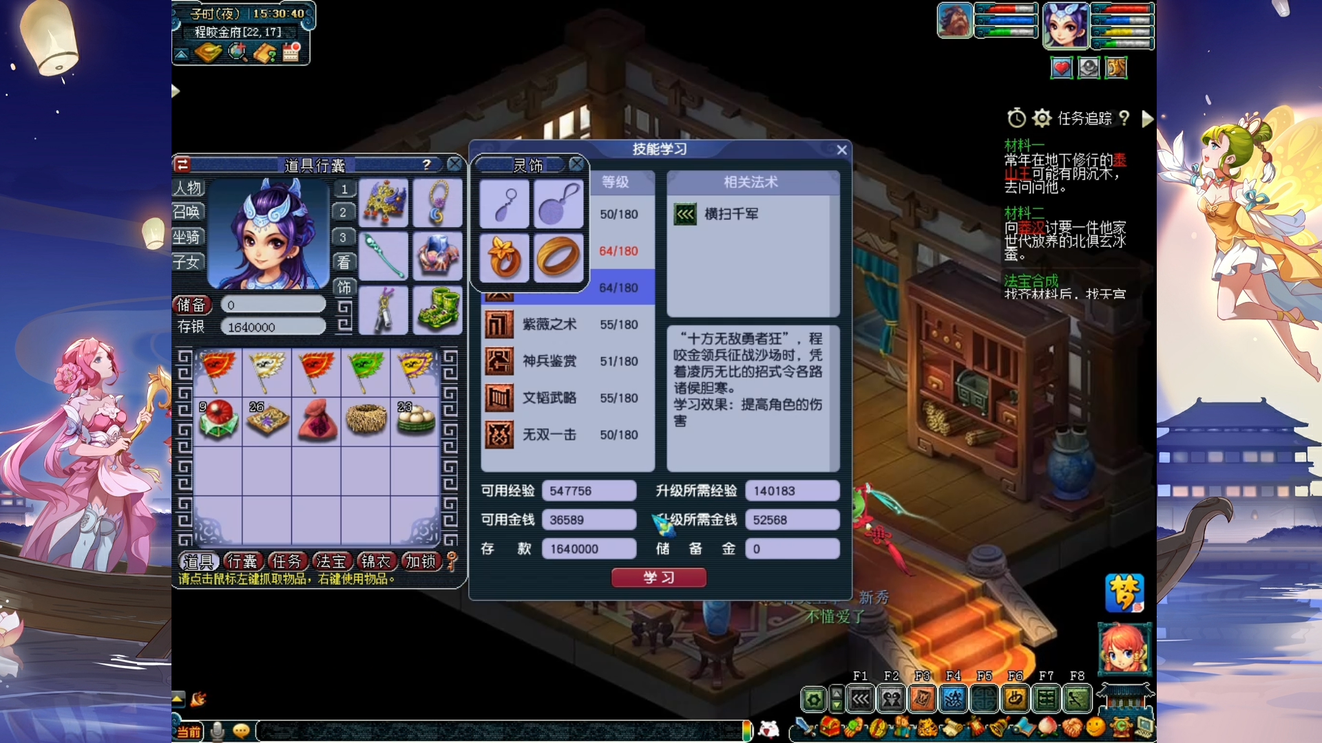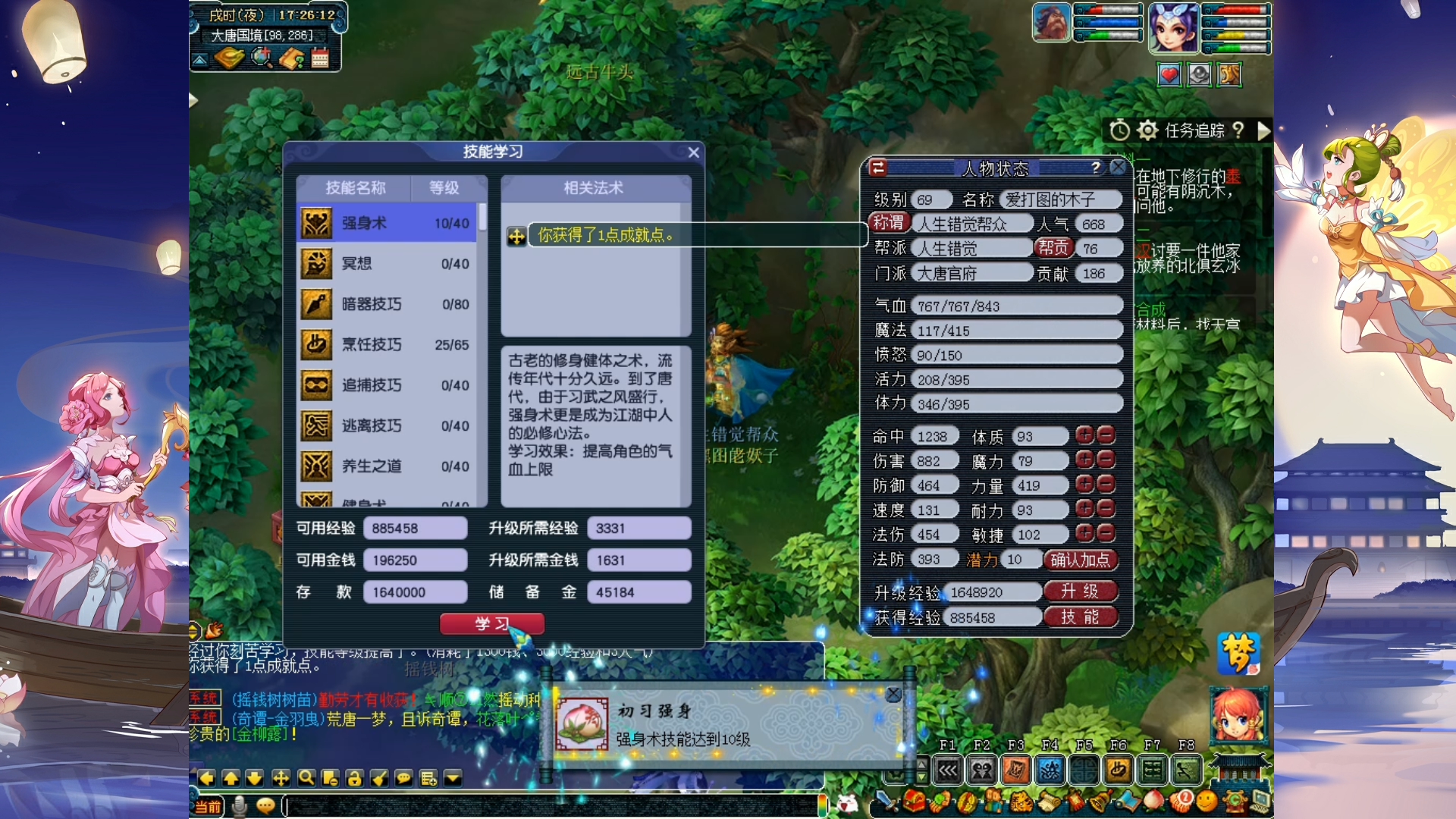 做完了师门任务,我打算升级一下师门技能,没想到点一下就是升两级,一不留意,把我现金拿去升级了,心塞塞!后来才知道,是我鼠标坏掉了,哎!