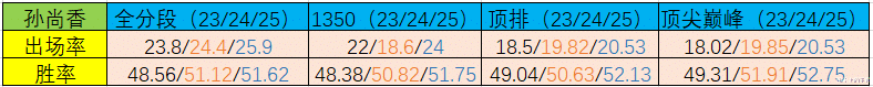 先看胜率,孙尚香的优化是在24日,所以我们要从23日开始看,可以看到,23日孙尚香的各个分段胜率情况,中分段往下胜率48%出头,中分段往上49%出头。