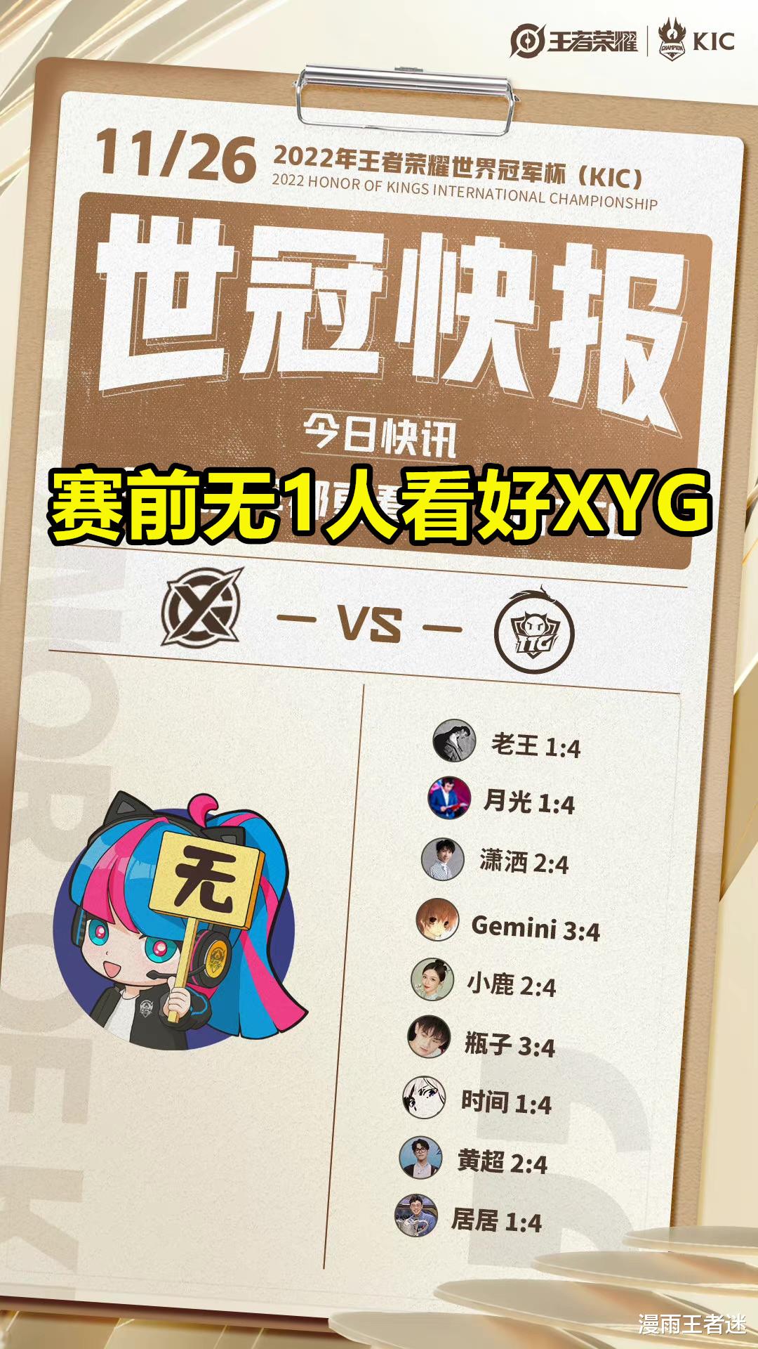 因为在比赛开打之前,几乎绝大部分网友都不看好XYG,甚至所有KPL业内人士都一边倒看好TTG,XYG无1人看好,直接触发了无老师的BUFF。然而,不被看好并不代表不能够做好。最终胜利是属于XYG的,世冠正赛名额也是属于XYG的。而TTG吃下这一场败仗之后,他们已经确定要去打预选赛第2轮了,压力并不小!
