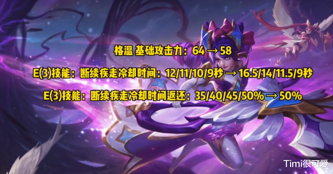 二:格温—下调了基础攻击力,增加了E技能的CD,并且减少了E技能前中期的CD返还。上次让你跑了,这次下场和永恩一样,脚都给你打断。