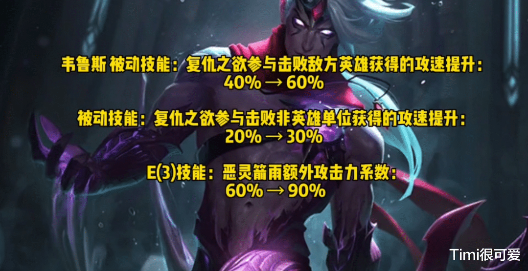 七:韦鲁斯—再一次进行加强,提高了被动击败英雄和单位时的攻速加成,以及E技能的AD加成。AP韦鲁斯笑麻了!