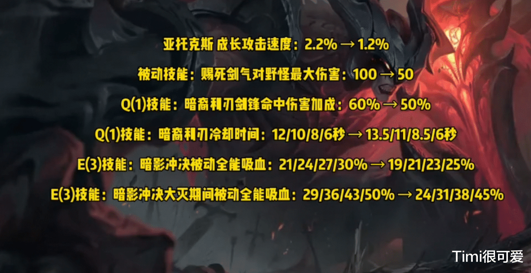 一:剑魔—下调了成长攻速,下调了被动对野怪的最大伤害,下调了Q技能的剑锋伤害和增加了Q技能的CD,下调了E技能的吸血效果。这就意味着告别了打野剑魔!