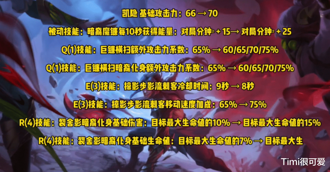 四:凯隐—大幅度增强,被动能量获取速度提高可以让凯隐更快变身,并且提高了Q技能的额外AD加成,蓝凯增加了E技能的移动速度,并且缩短了CD。红凯大招伤害和回血效果得到增强。