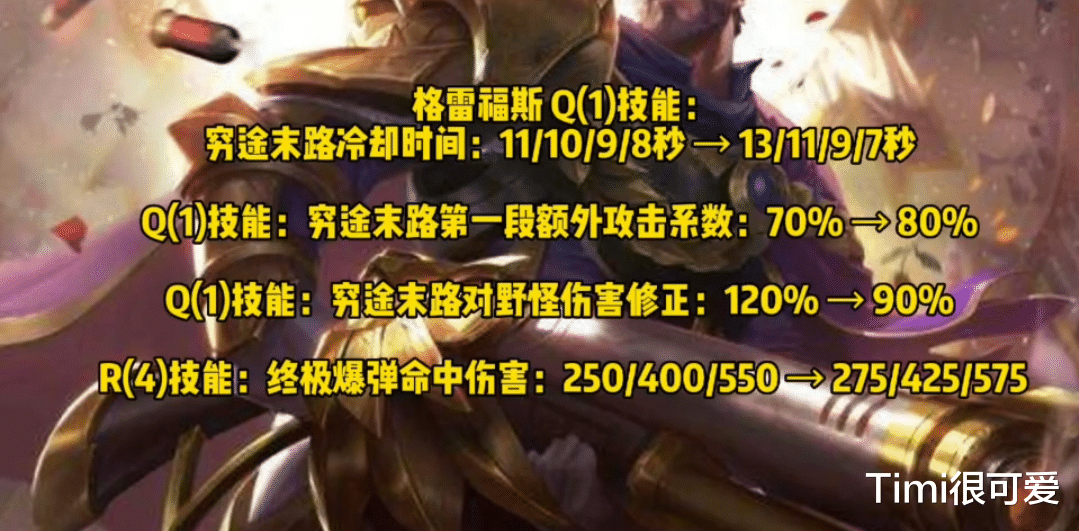 三:男枪—减少了Q技能的CD,并且提高了Q技能的AP加成,Q技能对野怪伤害下调,也提高了大招的基础伤害。