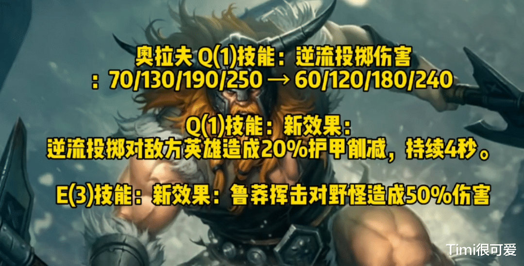 二:奥拉夫—下调了Q技能的基础伤害,但Q技能增加了穿甲效果。