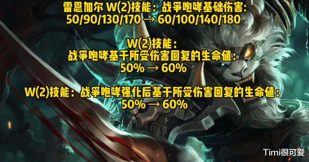 五:狮子狗—提高了W的基础伤害以及W回血效果比例,狮子狗做为打野胜率倒数,这次加强可以让团战更站得住脚。