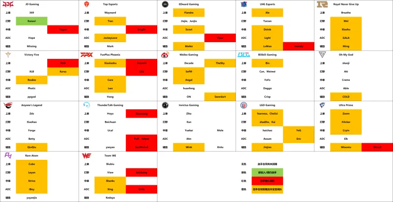 2022赛季转会期LPL各队选手官宣汇总一图流(注:同位置有合同已到期和合同未到期选手时,合同未到期选手在左)