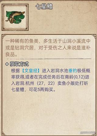 我们来看一下烟雨江湖对于七星鳢的介绍:滋补良品,获取方式需要根据文皇经进入岩洞水池极低概率获取,不过我大概17竿左右就钓到了,也可以在杭州(27,22)坐标位置的卖鱼小贩进行购买。