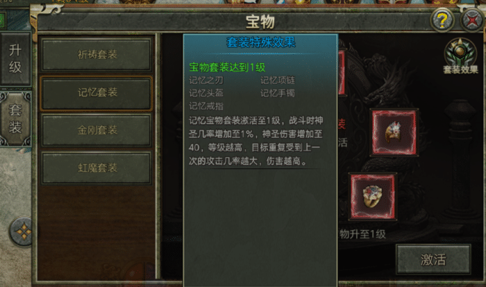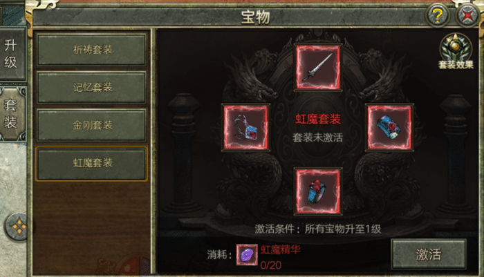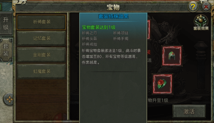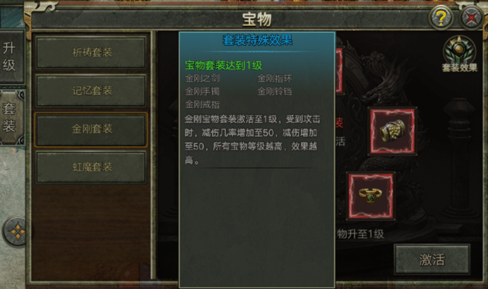 看世界杯的同时别忘了还有《传奇3复古版》哦休闲娱乐两不误!今天将给大家带来玩法介绍之宝物篇一起来看看玩法介绍1、服务器达到指定开服天数,将会开启「宝物」玩法;2、宝物为宝物套装,宝物套装下面分为多个相应的系列宝物;3、玩家达到相应的等级可以对宝物进行升级;4、宝物达到指定等级可以激活套装属性;5、宝物套装激活后,可以为玩家带来套装效果,套装等级越高,效果越好6、不同的套装会带来不同的套装效果。