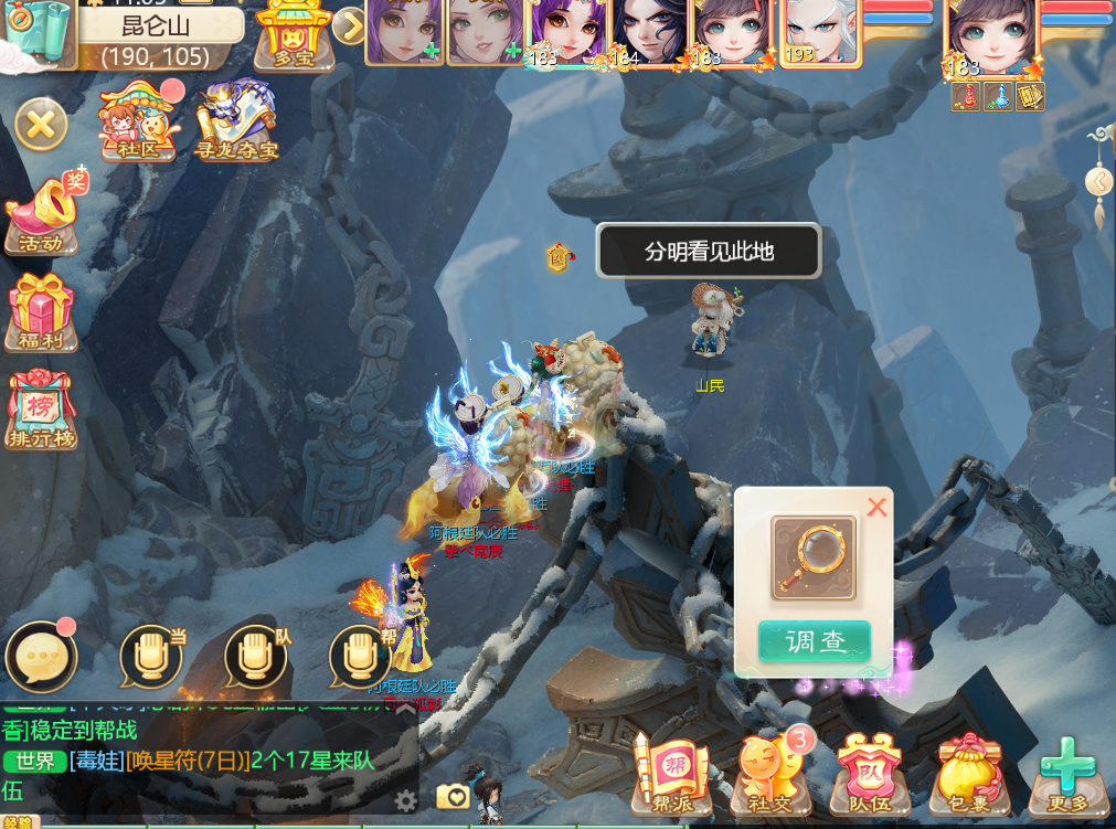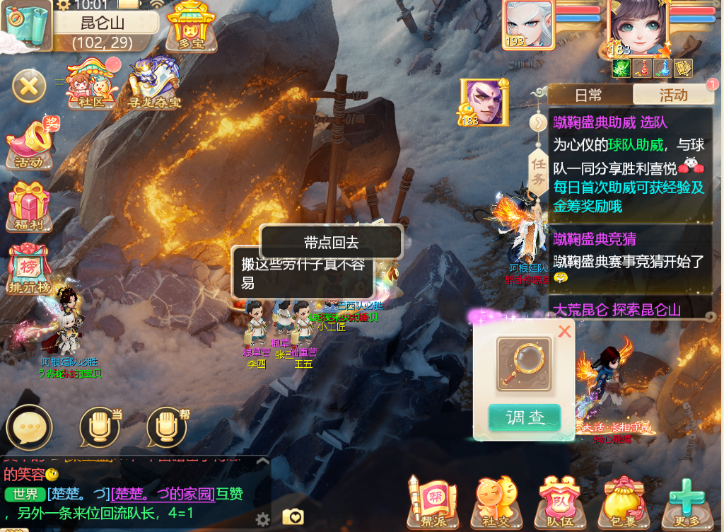 2.夸父巨弩,在昆仑山坐标(101.94)附近调查,并在当前频道发送“清理”二字。