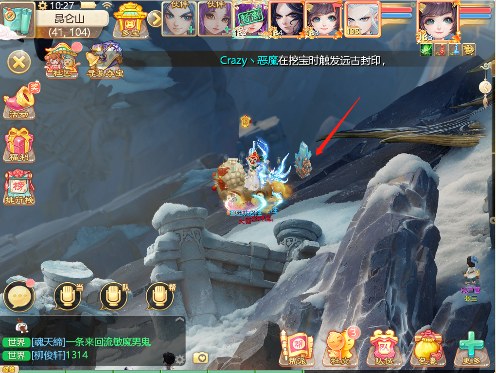 1.天柱,在昆仑山坐标(41.104)附近有个石柱,对其使用个性动作“攻击”。
