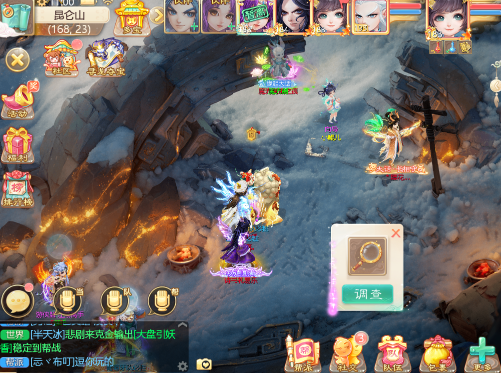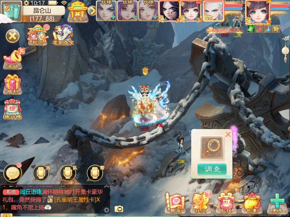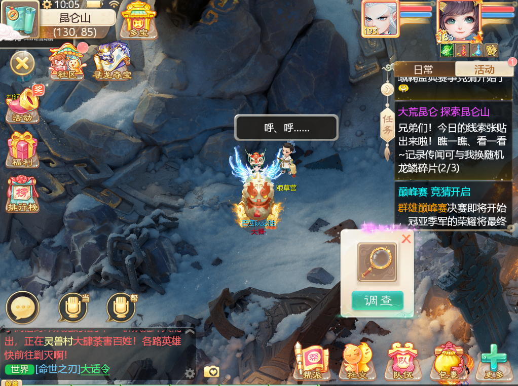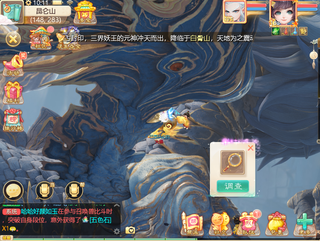 4.天生双翼,在昆仑山坐标(148.283)附近调查,并在当前频道发送“观察”二字。