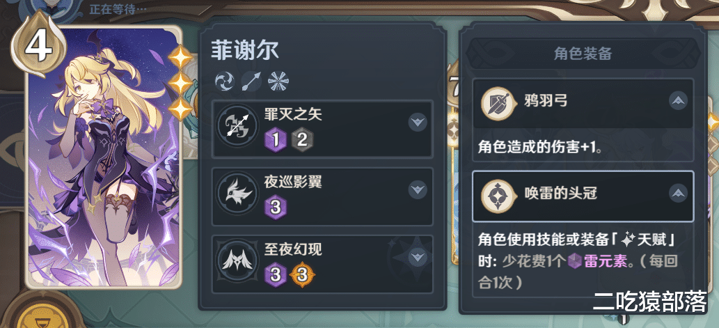 角色卡上的图都是各位的老婆老公,大家熟得很,左上角那个数字是当前角色剩余的血量,归零就GG了,三个技能各有效果点开可以看到,需要消耗的对应骰子也都标的很清楚。除此之外还有角色装备以及圣遗物,根据角色需求来装备会有很不错的效果,但是每个角色最多只能携带一个圣遗物和一个武器,和其他卡牌游戏不同的是,原神同时在场角色虽然有三个,但是只有一个在前台可以行动,想要换角色行动是要消耗骰子的。