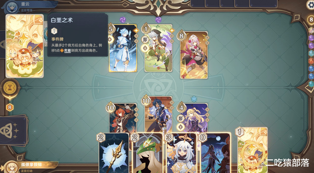 手牌就是各种效果牌了,左上角是消耗骰子数量,点击卡牌就可以看到详细的效果,卡牌最多持有十张,不过这些手牌还有一个特殊的效果,就是可以拖到右边骰子那里弃掉,每弃一张牌可以转化一个骰子变成当前出战角色所对应的元素骰,有用不到的手牌可以通过转化来让角色放更多技能。