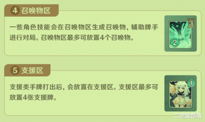 除了场上的角色之外,还有召唤物和支援卡,支援卡是手牌里的,都有不同效果加成,放在支援区;召唤物则是类似于菲谢尔的二技能召唤出的奥兹,放在召唤物区,它们都最多同时存在四个。