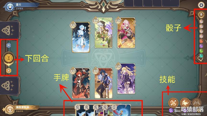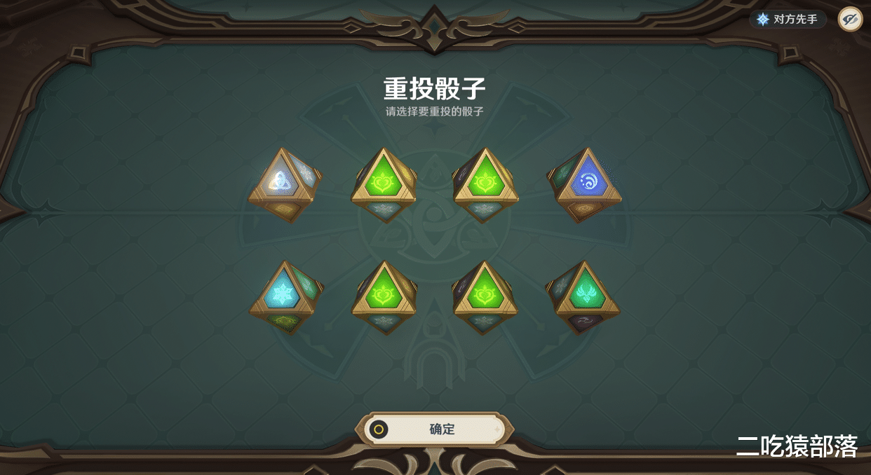 这个所谓的“骰子”其实就是行动力,你不管要打出手牌也好,换角色也罢,还是要放技能巴拉巴拉的,都需要消耗对应数量和元素要求的骰子,这个骰子会在每次回合开始前扔八个,你可以选不想要的骰子再投一次,有一个比较特殊的不属于任何一种元素的就是万能骰子,可以代替任意元素使用,在行动时,时刻注意骰子数量也是很关键的一点。