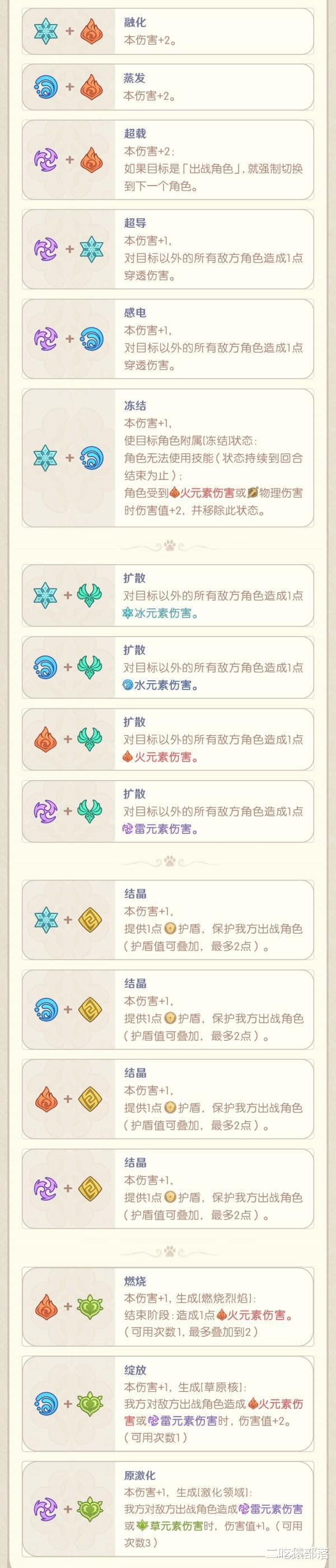 在打牌上,七圣召唤也没有舍弃独特的元素反应的玩法,有融化蒸发这种单纯提高伤害数值的,也有原激化燃烧这些带有其他效果的……图上说得很清楚了就不再复述了,再次强调了一点,不管是在游戏里战斗还是简简单单打个牌,元素反应都是打伤害不可或缺的重要途径!