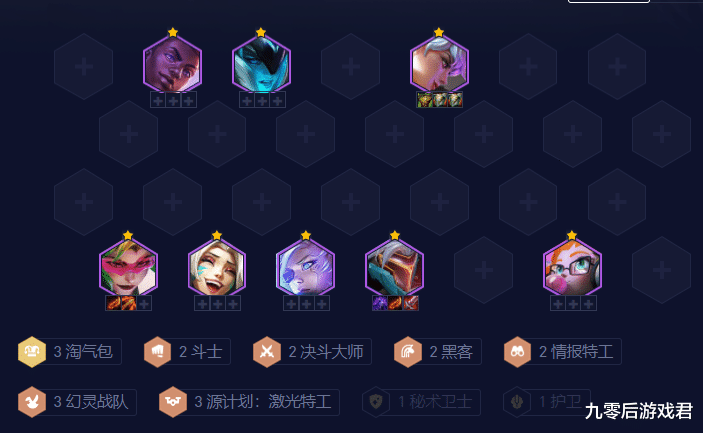 既然是把劫当作阵容主C那么就一定要根据劫的羁绊搭配阵容,劫在S8版本里面的羁绊为激光特工 黑客和决斗大师。三个羁绊分别搭配上佐伊与劫凑成双黑客,只要获得黑客里姆的效果就可以了,没必要追求极致的吸血效果。搭配上薇恩凑成一个双决斗大师,然后再搭配上一个艾希和一个猪女凑成三激光特工,这里就把劫所有的羁绊都搭配出来了,可以让劫在阵容里将输出最大化。另外薇恩和艾希还可以组成双情报特工,作为后排输出情报特工羁绊可以给他们超强的机动能力和生存能力。