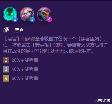 在S8版本里面有一个非常特别的羁绊黑客,这个黑客羁绊可以召唤一个黑克里姆,里面的效果是会被带到敌方后排并且在战斗开始的几面内处于无法被选取的状态,也就是说黑客不但让羁绊内的一个英雄可以有刺客跳入对方后排的效果,还可以规避第一波的一部分输出。所以黑客搭配上劫就可以达到刺客突入后排的效果,当然不会让劫具备刺客的暴击率,但可以获得一定的全能吸血。但对于当前没有刺客的阵容,这已经非常的难能可贵了。