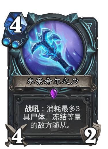 不过可能有朋友担心霜之哀伤费用太高,对局的时候这个能触发的次数不多。这个肯定是不存在的,目前官方已经爆料了一把非常好用的武器:米奈希尔之力,消耗最多三具尸体,冻结等量随从。这是一把4费4-2的武器,还是很好用的。