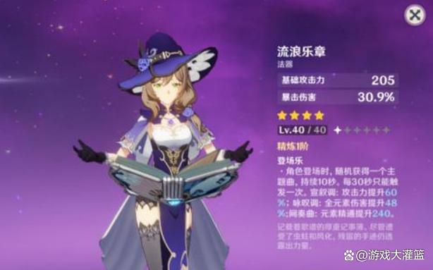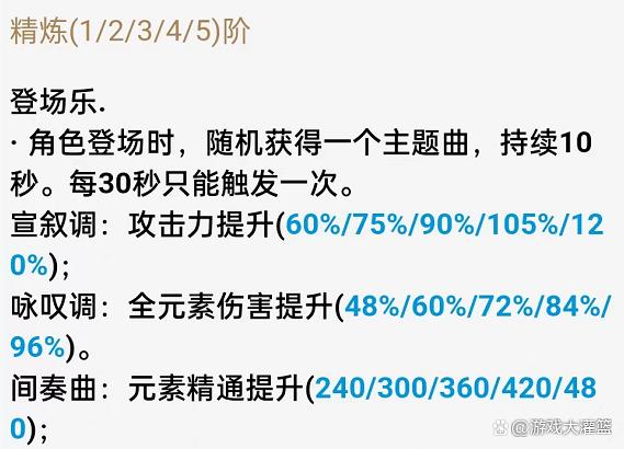 流浪乐章的被动技能登场乐,分为三个乐谱篇章,宣叙调增加攻击力,咏叹调增加角色的全元素伤害,间奏曲增加角色的元素精通,我们可以看到流浪乐章是莫娜的输出装。