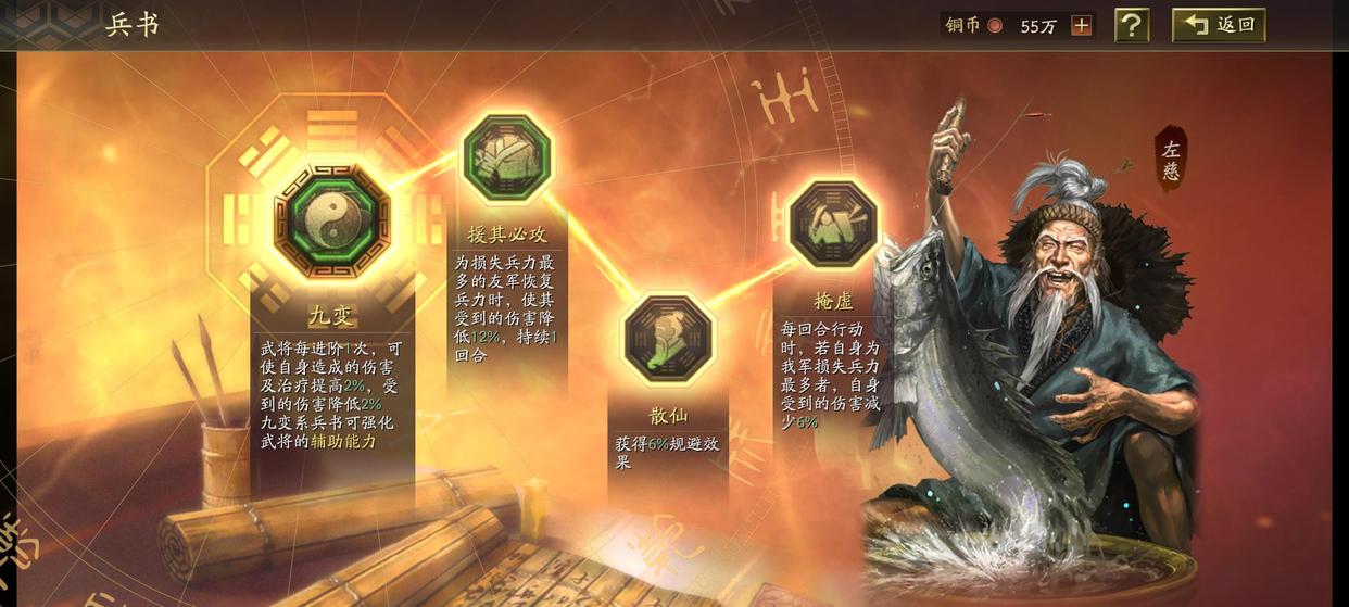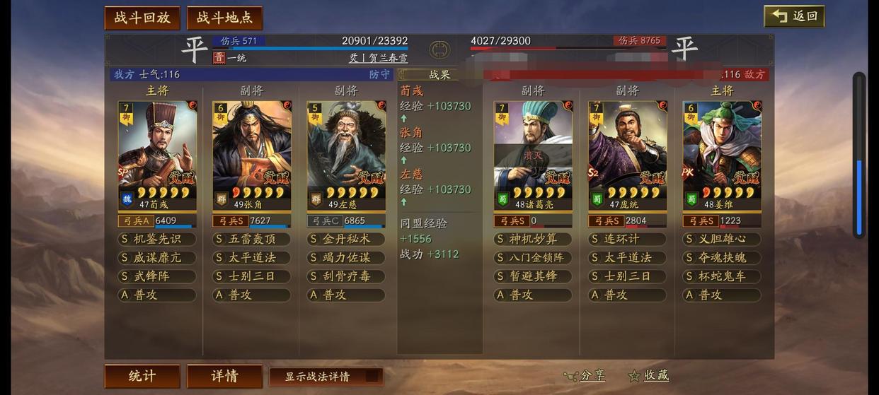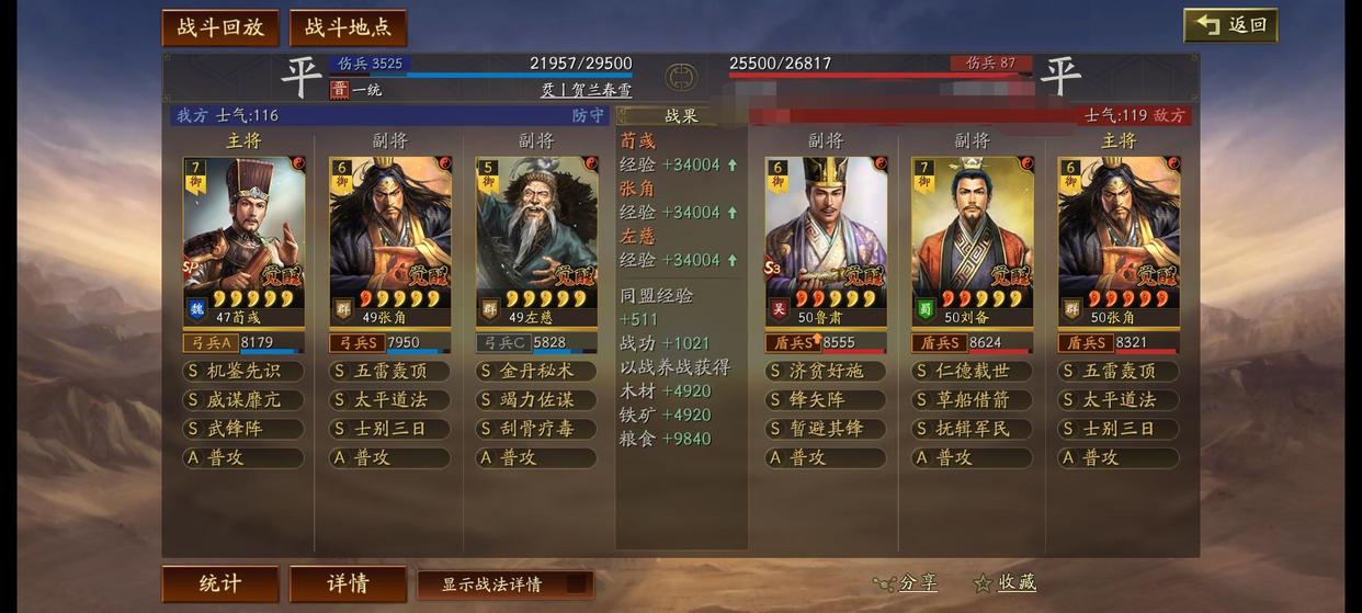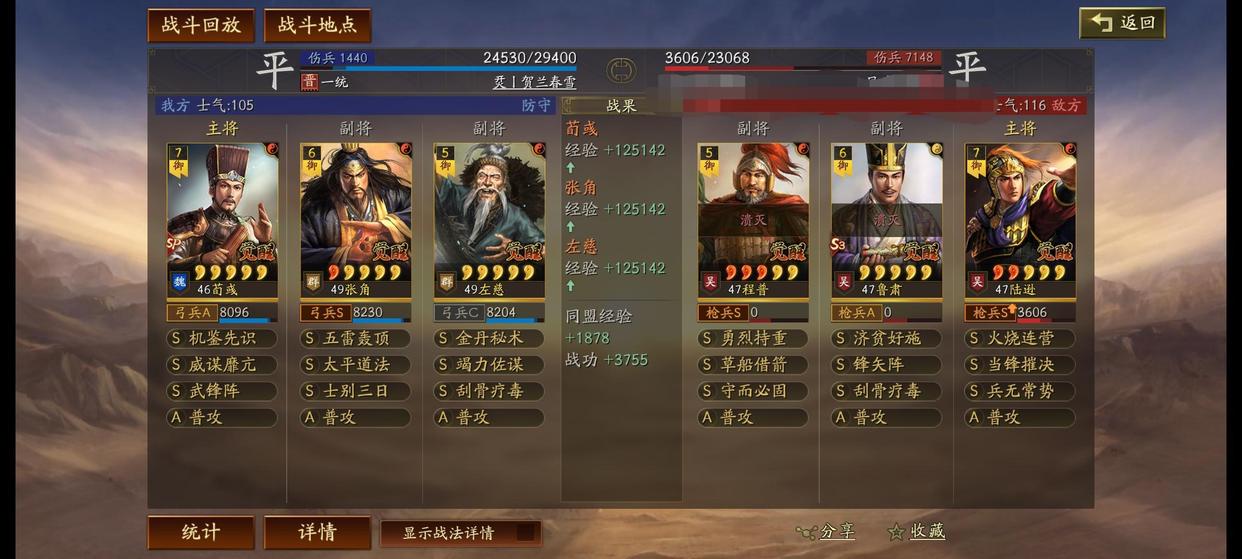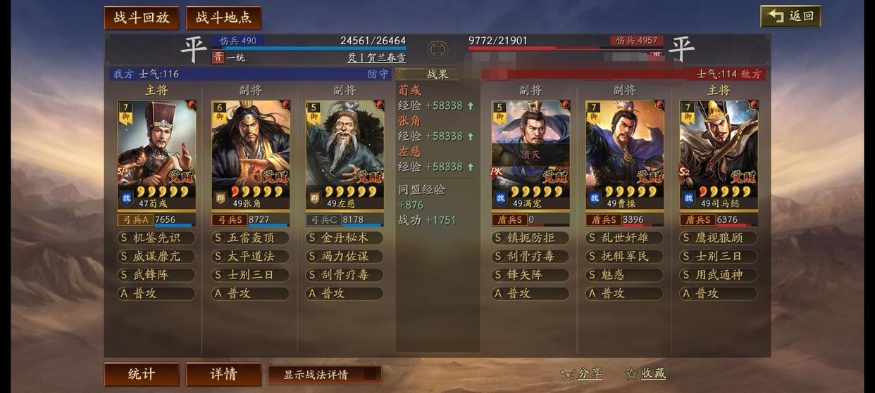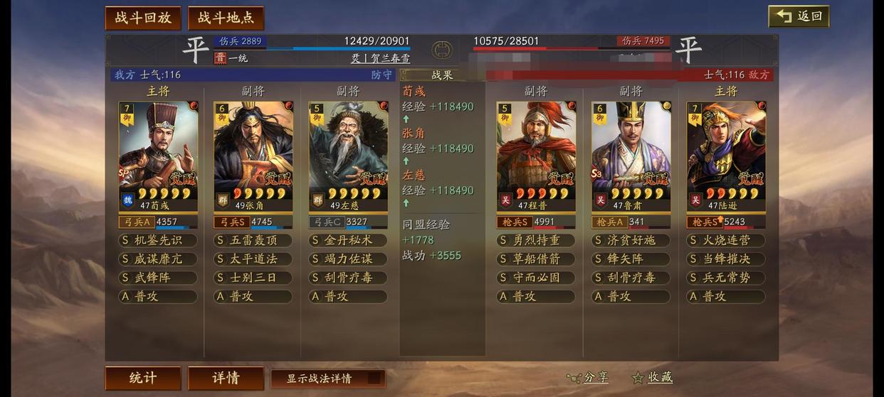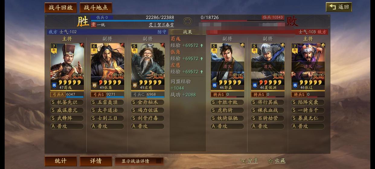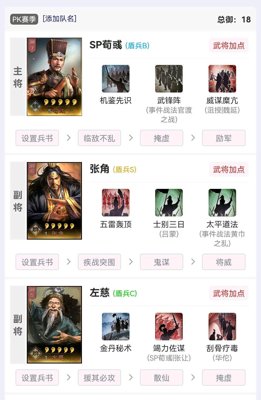 左慈前期闪避配合sp荀彧警戒给队伍上双保险!佐谋降低敌人智力最高的20%,避免张角破不开敌人防御的尴尬!佐谋配合刮骨疗毒保证sp荀彧的兵力安全!