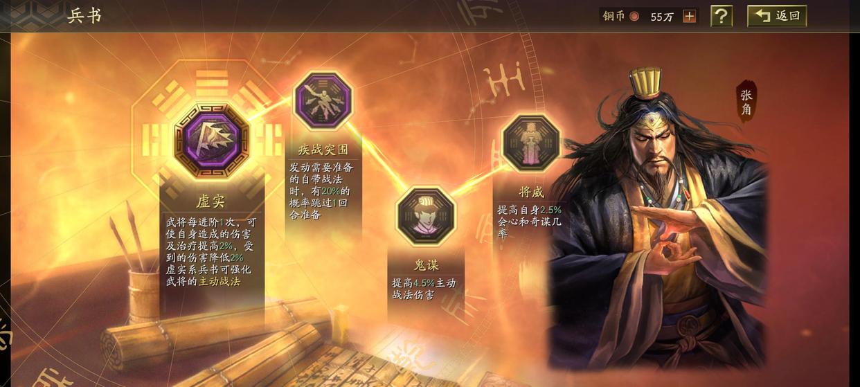张角要带有专属天公比较好!士别三日与太平道法配合闪电五连鞭输出成吨伤害!张角红度越高越好,解决智力不够的问题!