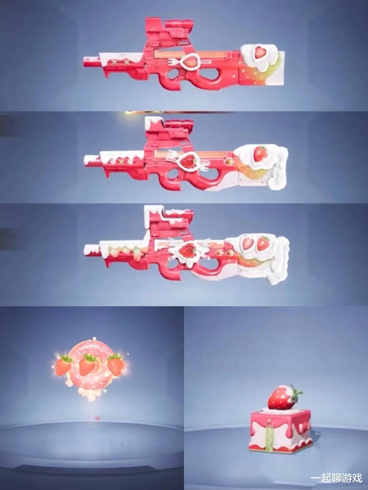 其中的P90升级枪,外观采用了玩家们比较偏爱的“猛男粉”,淘汰烟雾、7级盒子等特效也均与草莓、甜品有关,整体看起来还算不错,起码比千篇一律的衣服要好上许多。