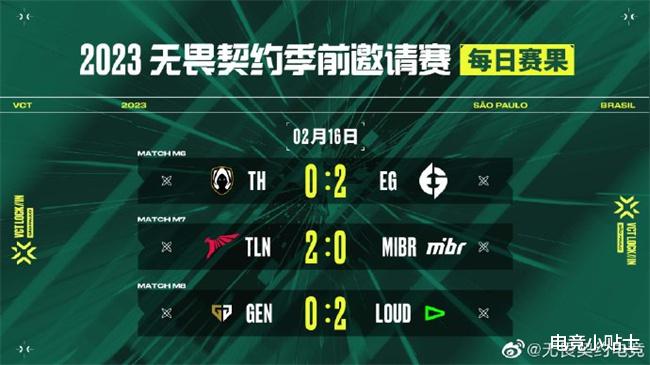 2月16日凌晨,无畏契约冠军巡回赛季前邀请赛阿尔法半区淘汰赛16进8第三日的比赛在激烈的对抗中圆满结束。在第三日的比赛中,EG战队2:0击败TH战队,TLN战队2:0击败MIBR战队,LOUD战队2:0击败GEN战队。
