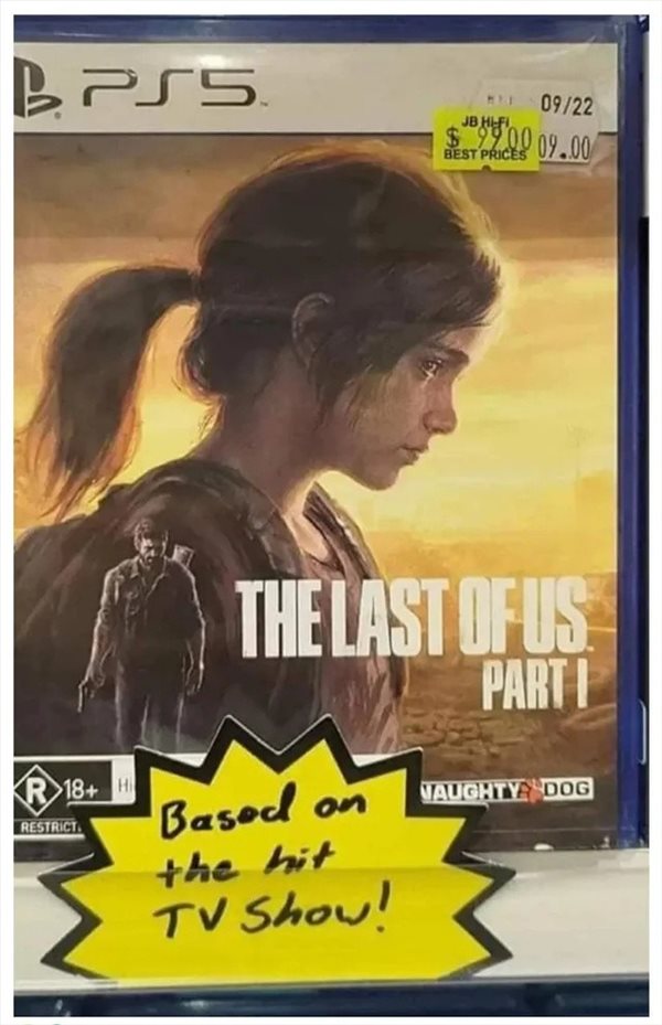 近日,澳大利亚一家零售店对《最后生还者:第一部》的宣传语却令人啼笑皆非,这张售价99澳元的PS5光盘上,赫然写着“根据热门美剧改编”的宣传语。