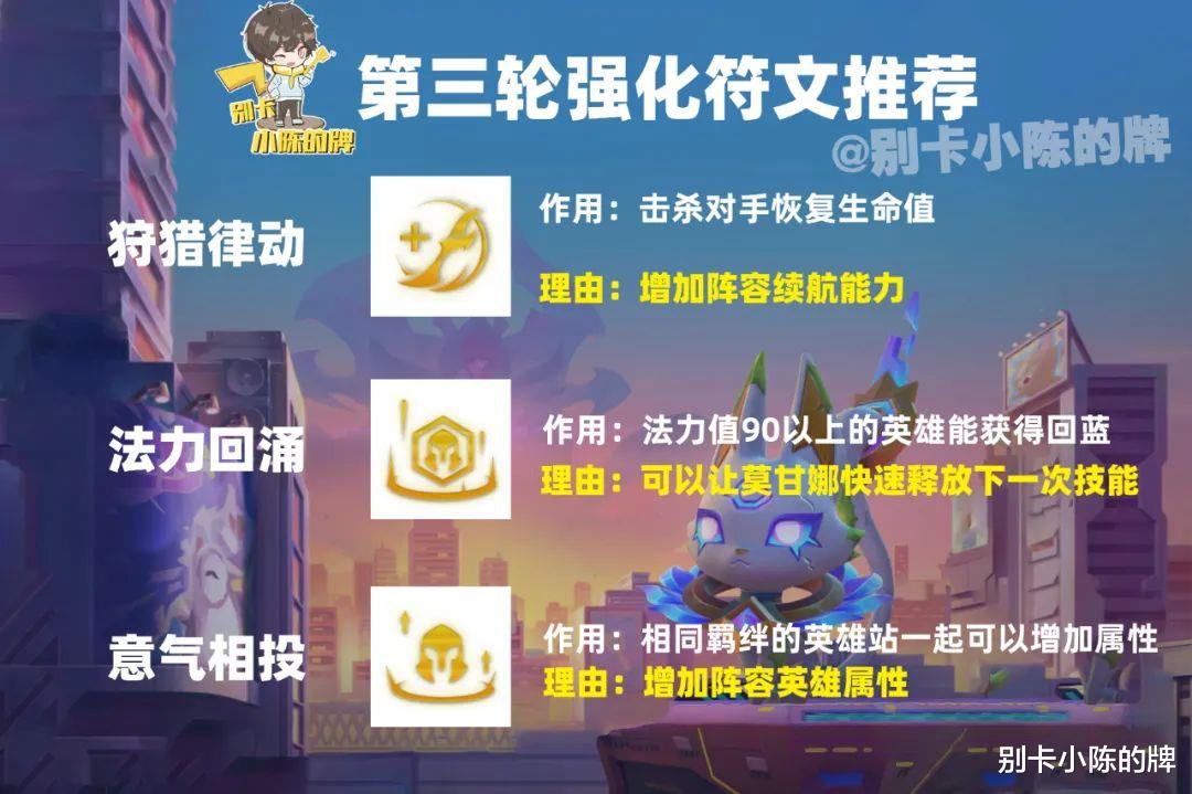 第三个强化符文推荐:法力回涌,意气相投,狩猎律动由于莫甘娜的法力值是120,因此也是可以受法力回涌的效果,其次就是续航类的强化符文也可以辅助莫甘娜提升续航能力,让莫甘娜持续抗伤并且释放技能才可以让阵容上限更高。