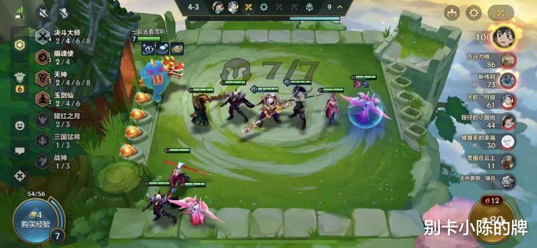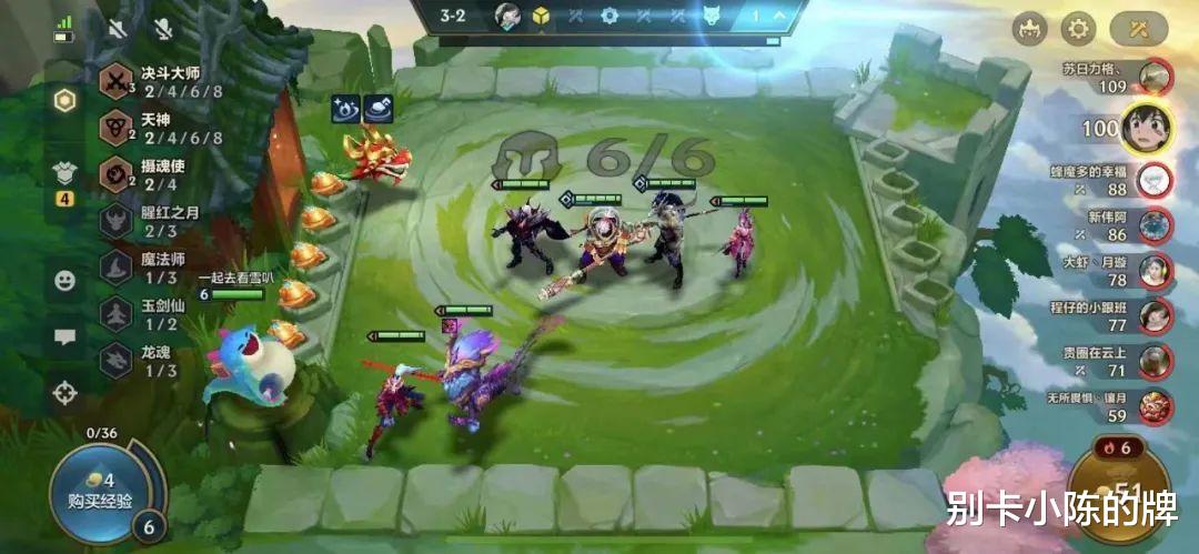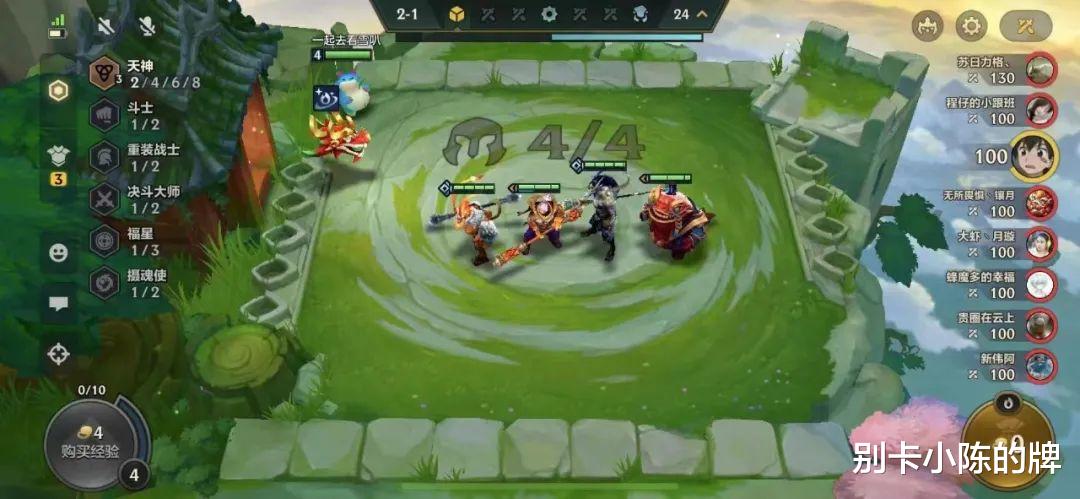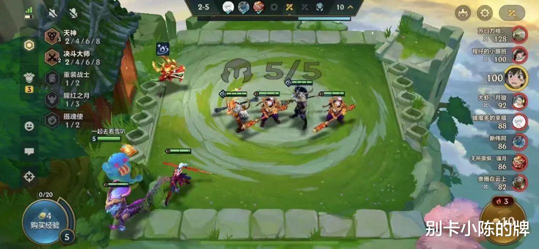 2阶段:2-1升四人口,优先用四决斗大师连胜过度,由于我们需要的是防御装备优先,因此尽可能保证前期的连胜迅速上人口即可,可以看到水友这里选择了上了三天神,虽然羁绊单一但是阵容的质量还是非常好的