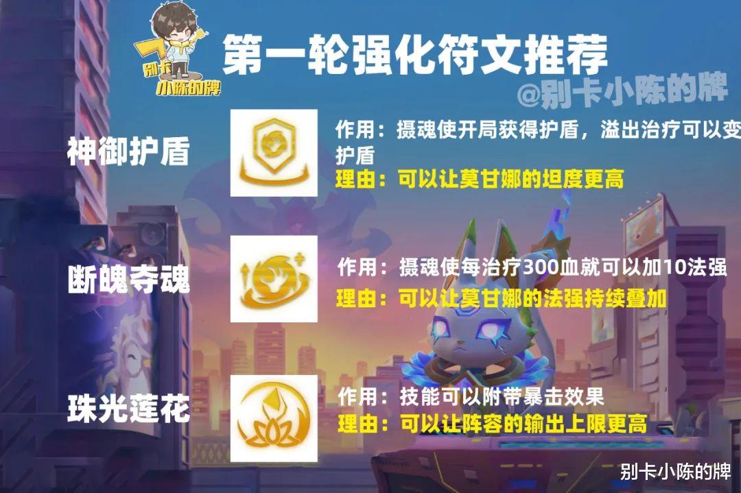 第一个强化符文推荐:神御护盾,断魄夺魂,珠光莲花对于阵容契合的神御护盾和断魄夺魂这两个顶级强化符文就是必选的,其次如果想要提升阵容的输出上限以及莫甘娜的受治疗量也可以选择珠光莲花,对于永恩和莫甘娜而言是非常受益的。