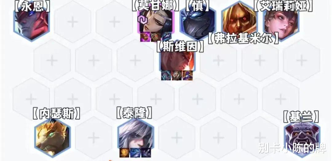 6阶段:后续上九人口优先补基兰开二秘术师,也可以用任意二星五费卡代替基兰,这局并没有遇到同行,并且我们还搜到了三星莫甘娜,同时我们也可以看到二星斯维因+二星基兰+二星永恩,这就是前期大连胜的好处。