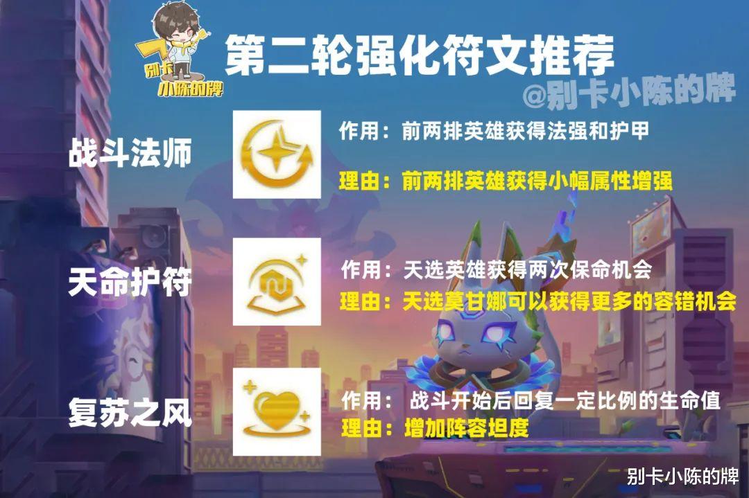 第二个强化符文推荐:战斗法师,天命护符,复苏之风由于阵容中的核心抗伤位是莫甘娜,所以续航类的复苏之风和两次保命机会的天命护符也是可以选择的,同时由于莫甘娜是站在前排,因此战斗法师也可以提供莫甘娜法强和护甲加成。