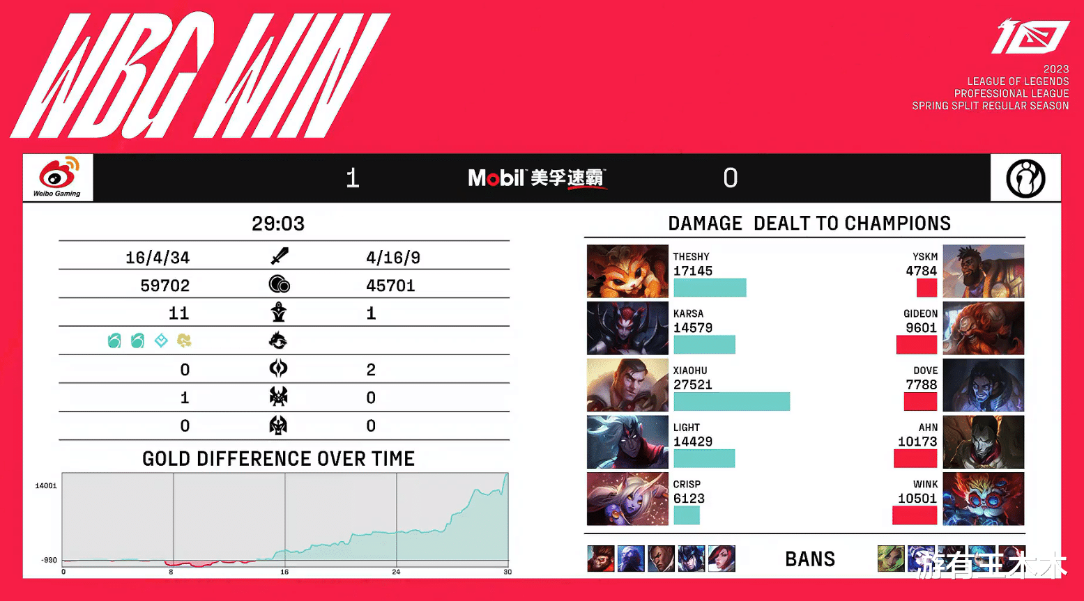 最终WBG战队冲上高地,纳尔跳脸被强杀,但Light韦鲁斯顺利收割战场,烬走出泉水送他五杀,WBG战队成功赢下第一局比赛!