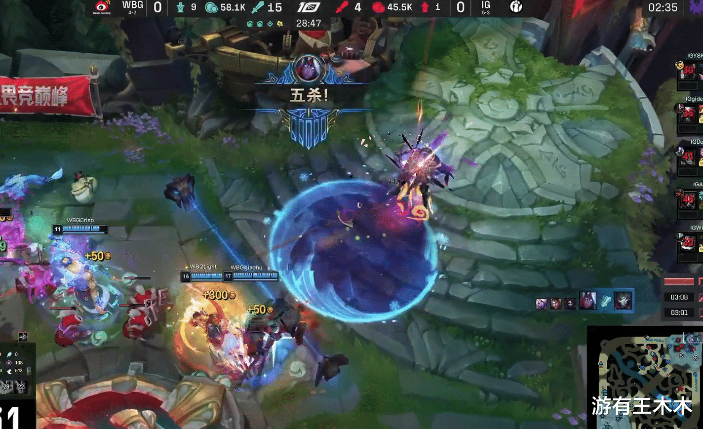 于是WBG三路对线优势,TheShy纳尔疯狂单带,不断扩大经济差距。直到24分钟IG战队忍不住了,在中路强杀奶妈,还试图再凶一波。然而WBG战队丝毫不虚,趁IG技能没转好果断反打,连杀四人拿大龙。