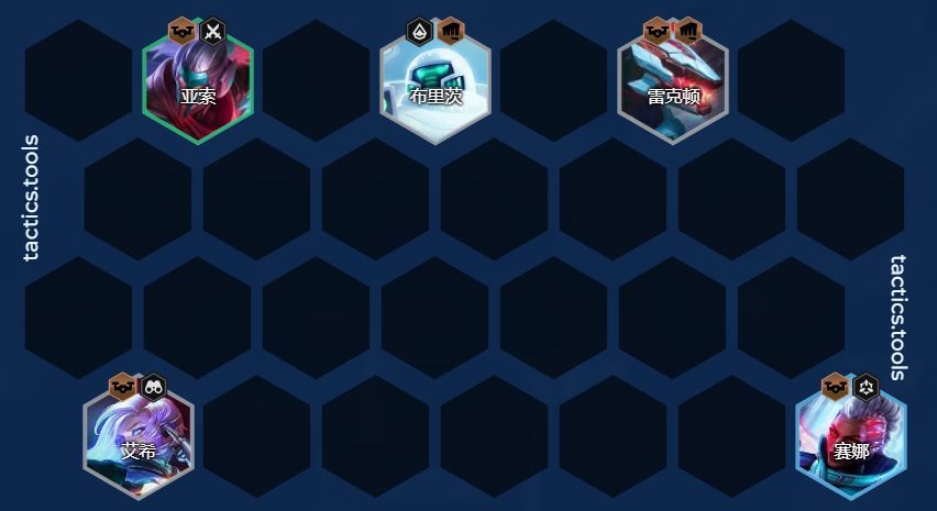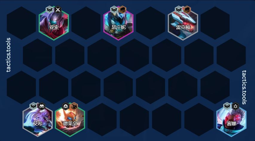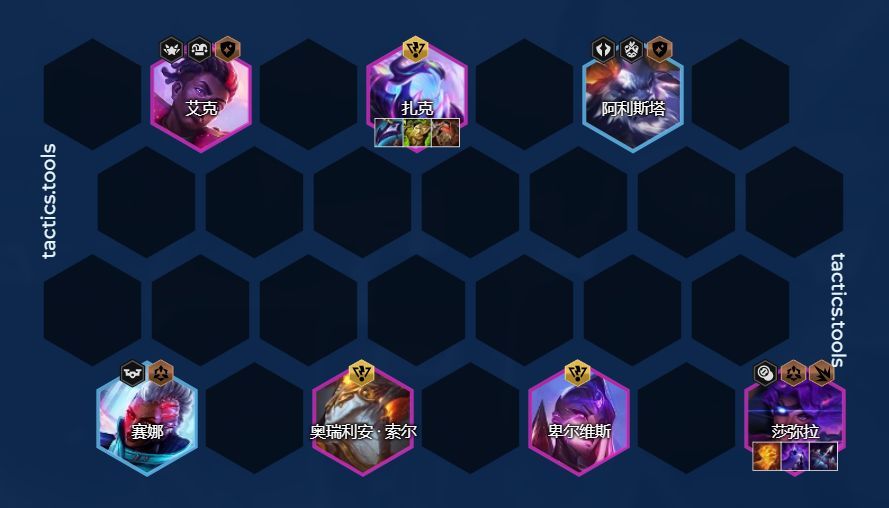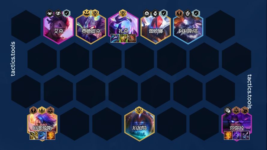 阵容组成:阿利斯塔、莎弥拉、厄斐琉斯、艾克、厄加特、扎克、蕾欧娜、费德提克
