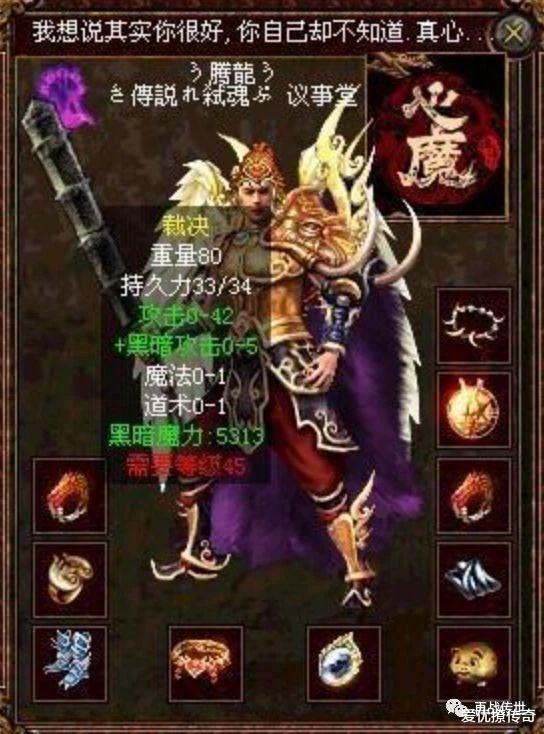 2、腾龙:十五区五羊的代表人物,也是被誉为最接近神的男人,身上极品装备无数,光麻痹戒指都有8枚,最具代表性的就是他那把垄断全区资源打造的42攻裁决,已经是裁决能达到的极限了。