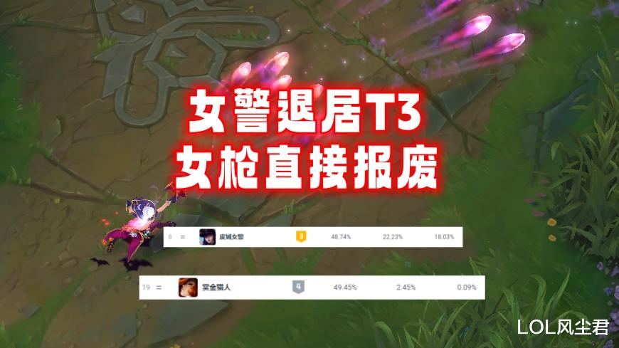 厄斐琉斯没啥好说的,设计师完全不敢加强,而滑板鞋最近在AD位置小小活跃了一下,处境也没VN那么尴尬,此前表现较为强势的女枪,在经历过多次削弱之后,已经重新回到了下水道,登场率和胜率都直线下跌,同样强度下降的还有女警,虽然登场率高达22%,但胜率仅有48%,不过比起其他英雄,女警还是契合版本的。