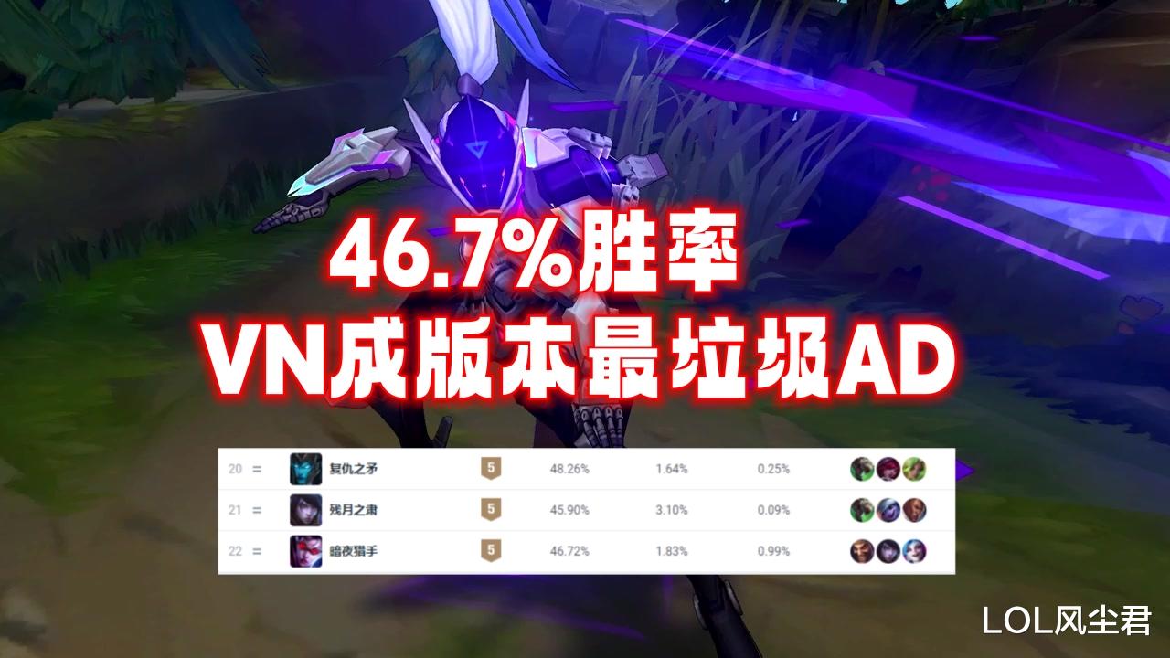 先来看一下目前版本,表现比较差劲的AD英雄,作为后期最强的ADC,VN从上线以来,首次成为版本下水道英雄,登场率仅有1.8%,并且46.7%的胜率也在AD位置垫底,没有AOE伤害,清线能力过差,薇恩已经成为了版本弃子,同样表现不太亮眼的,还有厄斐琉斯和滑板鞋,都是目前版本T5级别的下水道英雄。