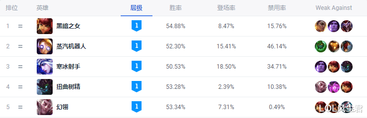16.6%的登场率,52%的胜率,妥妥的版本强势英雄,而目前位列版本T0层级的英雄,就是前期打架能力最强的莎弥拉了,登场率16.7%,胜率高达52.4%,最夸张的是这个英雄的禁用率,目前已经来到了54.7%,从这个榜单就能够看得出来,目前版本的强势英雄,都是前期有强推线能力的,并且前期有很强的打架能力。