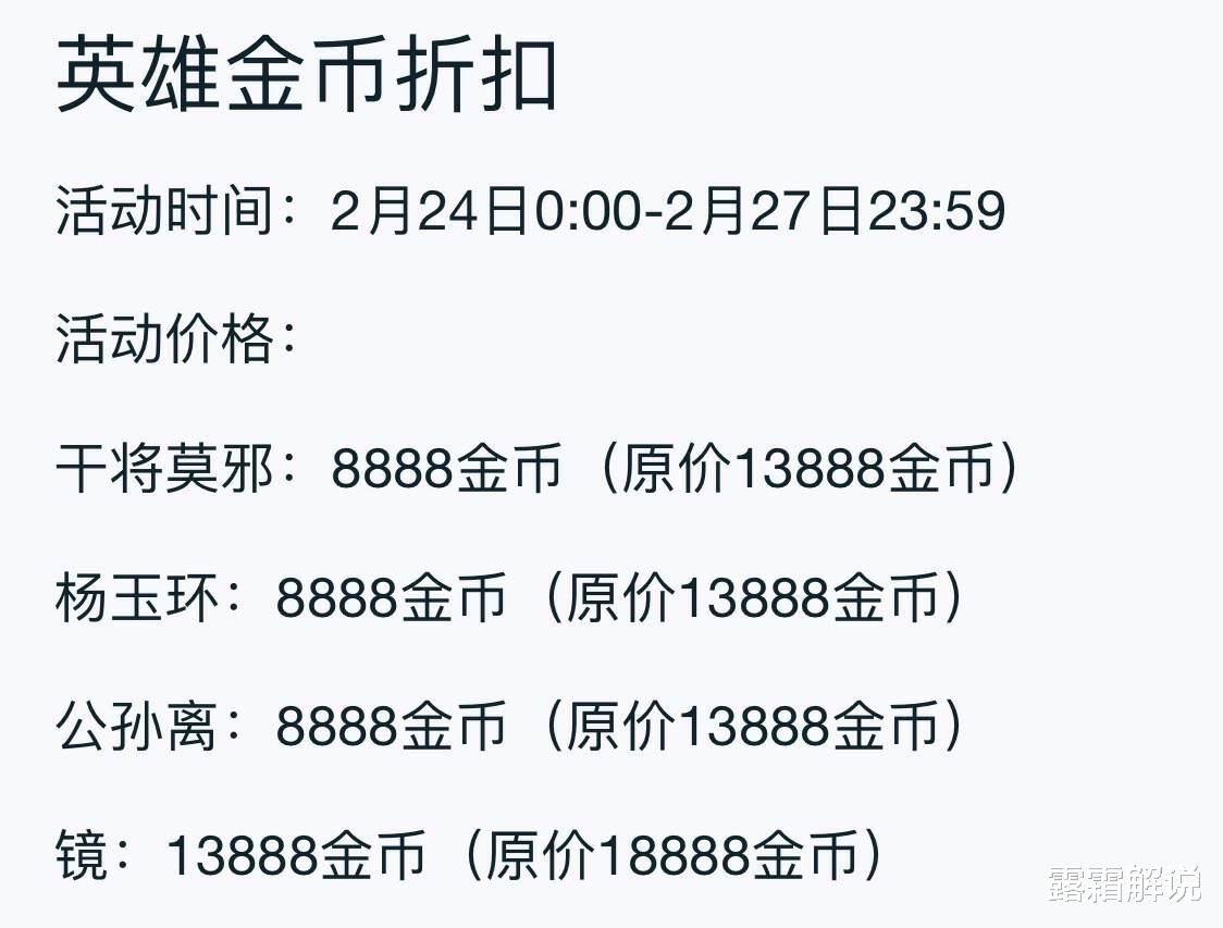这次更新有个英雄的金币价格迎来了折扣,这4个英雄分别是干将莫邪、公孙离、杨玉环还有东方镜,英雄打折也就意味着这几个英雄有新皮肤,恰好这些英雄的新皮肤,前段时间都有网友爆料过。