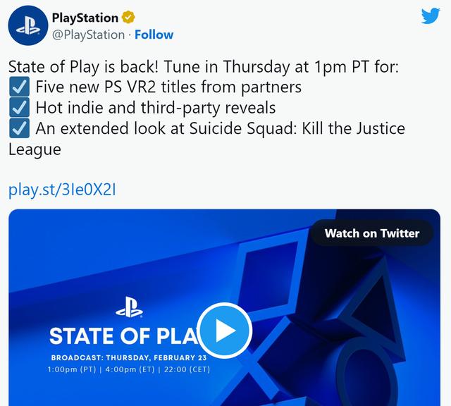 SIE宣布他们将于太平洋时间2月23日下午1点举行新一期State of Play,北京时间为2月24日早晨5点。