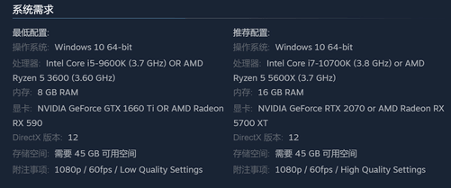 推荐配置已经能看到锐龙5000和RX5700XT,足以看到这款游戏的游玩门槛还是挺高的,一般的老爷机配置建议弃疗。