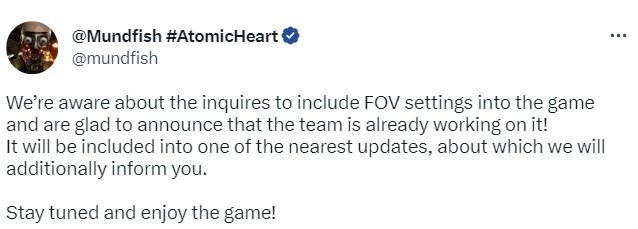 在《原子之心》发售之后,一些玩家可能不太适应游戏内的视角,导致头晕干呕的情况出现,但游戏中现在并没有调整视角的FOV设置选项,针对这一点,开发商Mundfish今天发文表示,已知晓玩家对FOV设置的疑问,开发团队正在努力解决中,该功能将包含在最近的更新中,具体详情之后公开。