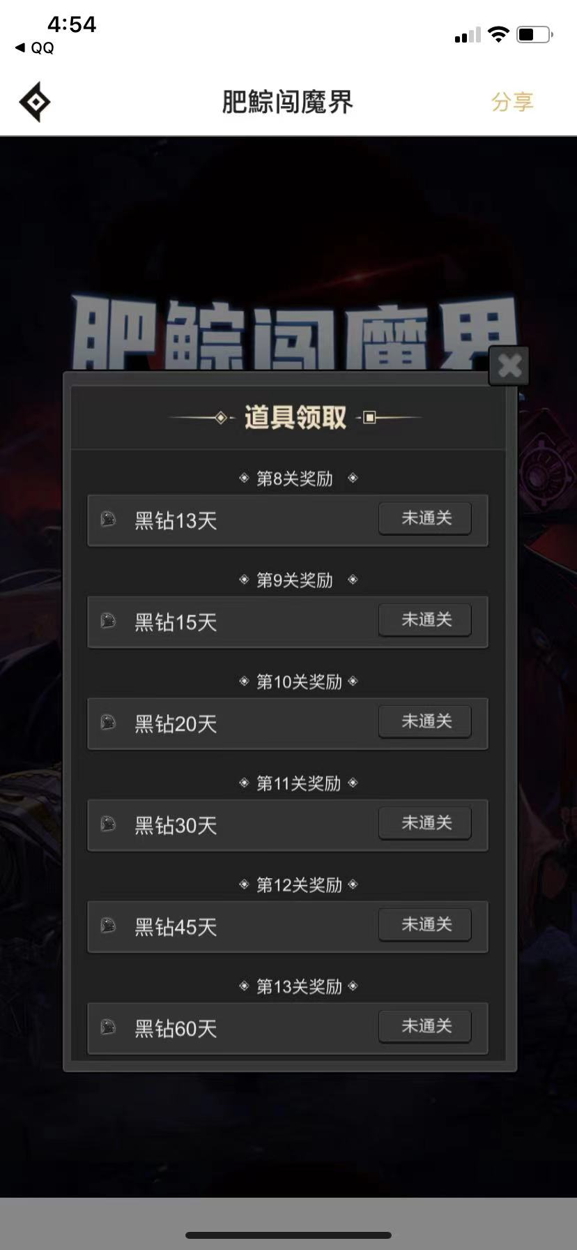 13个关卡,通关就送黑砖,对应的分别为1天,2天,3天,5天,7天,9天,11天,13天,15天,20天,30天,45天,60天。