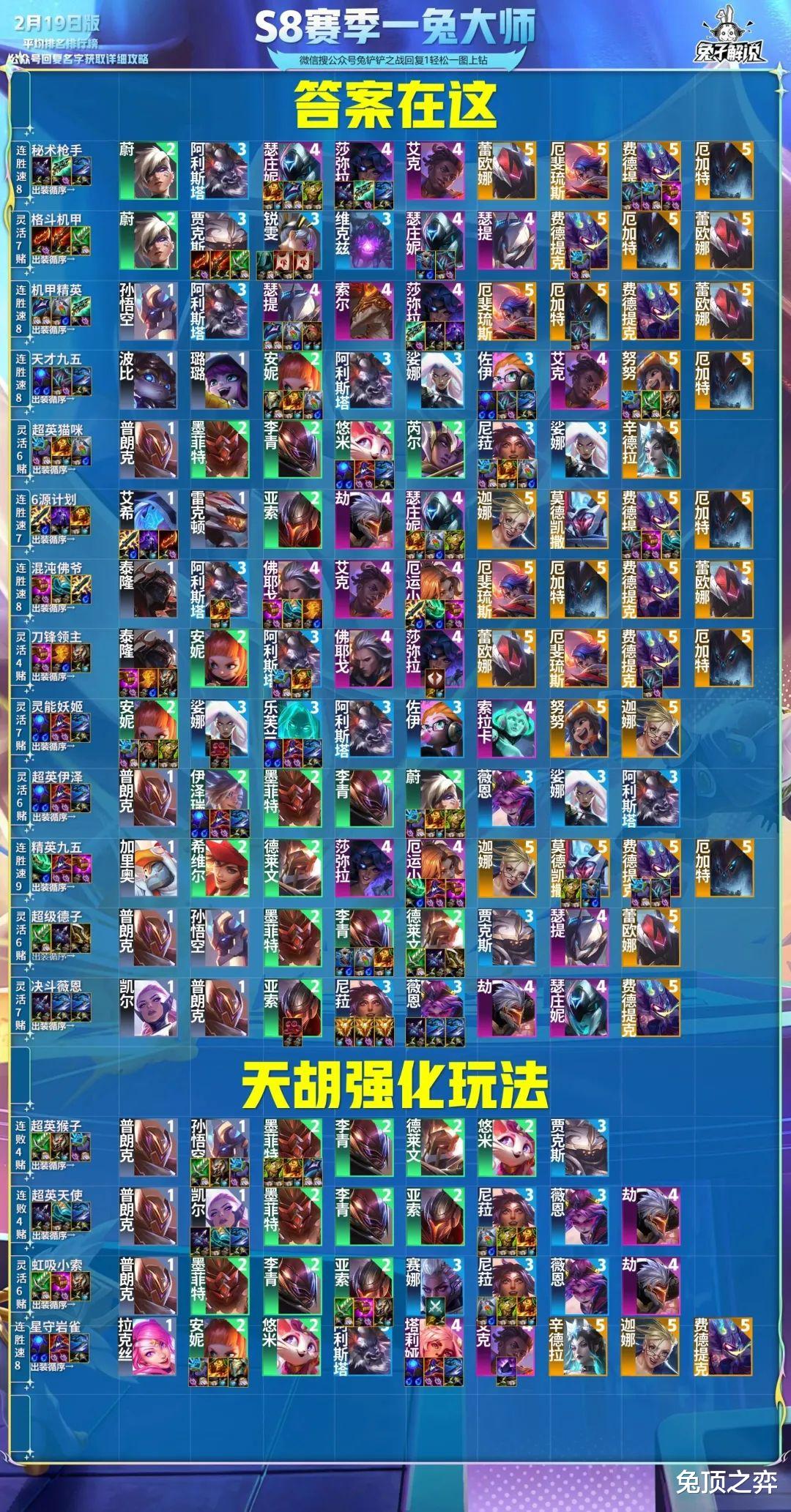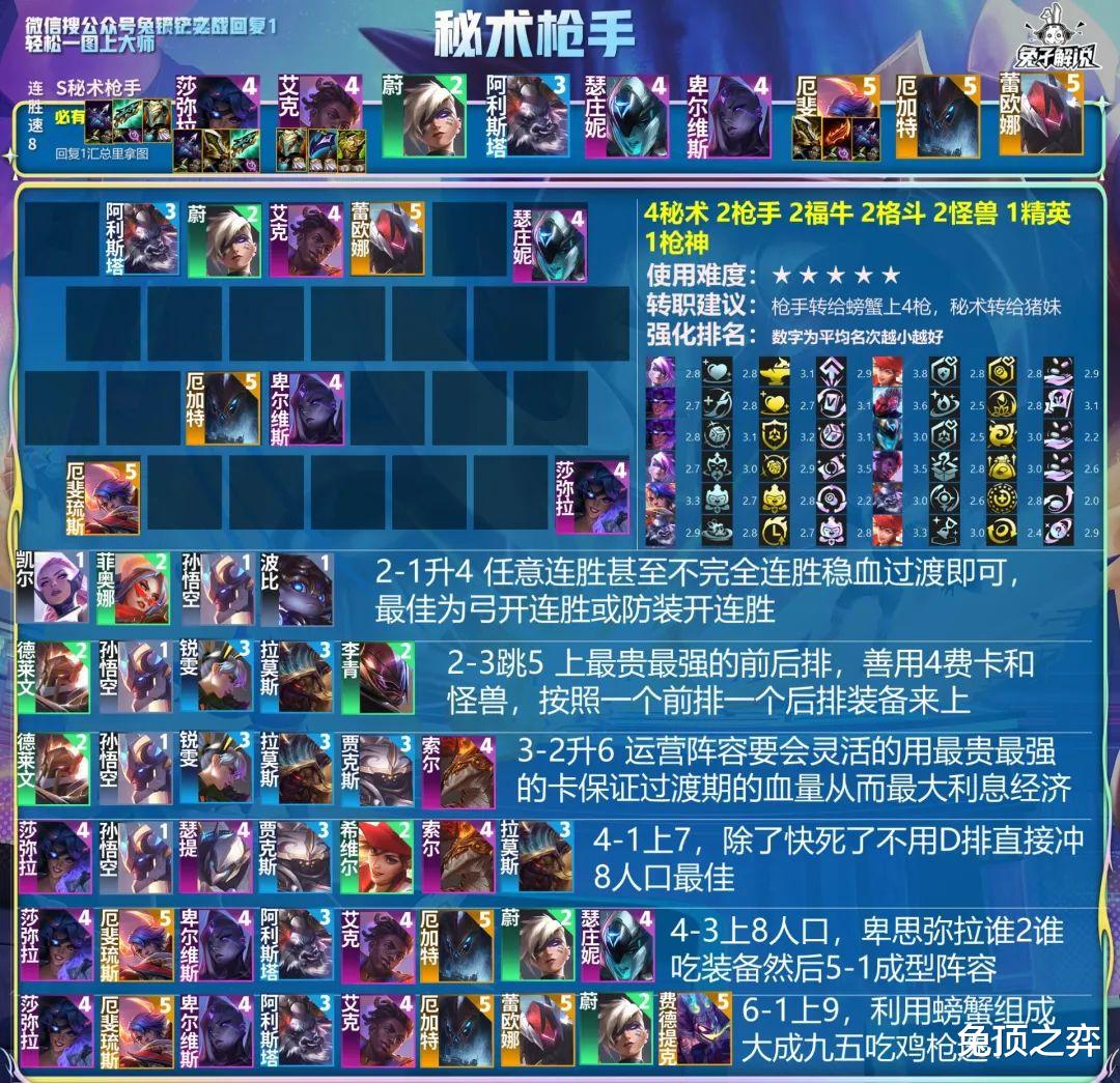 现版本推荐优先考虑运营阵容,上限更高一些,开局先看是否是1选的强化,如果是1选的强化,伊泽和男刀优选,2选和3选的强化,就不要卷赌狗阵容,会吃大亏,运营阵容优先推荐天才九五,成型8口1张努努就可以上9,贾克斯多的时候选秘术枪,反克制一手,打贾克斯一定挂扎克+高秘,机甲尧看环境再玩,爆发阵容少再玩机甲,或者非常胡,源计划一坨,不是纯连胜别碰,8人口成型就上不了9了,猫咪也一般,有猫之精准可以玩,最后德莱文要看场外贾克斯多少,贾克斯少,超英体系少,德莱文才强,小贾嘛,低能阵容,兔子是不屑的,主要是抽不到2和3,兄弟们胡可以冲,算是版本比较毒瘤的答案了,不过玩小贾不要想着吃,上限在那摆着呢。