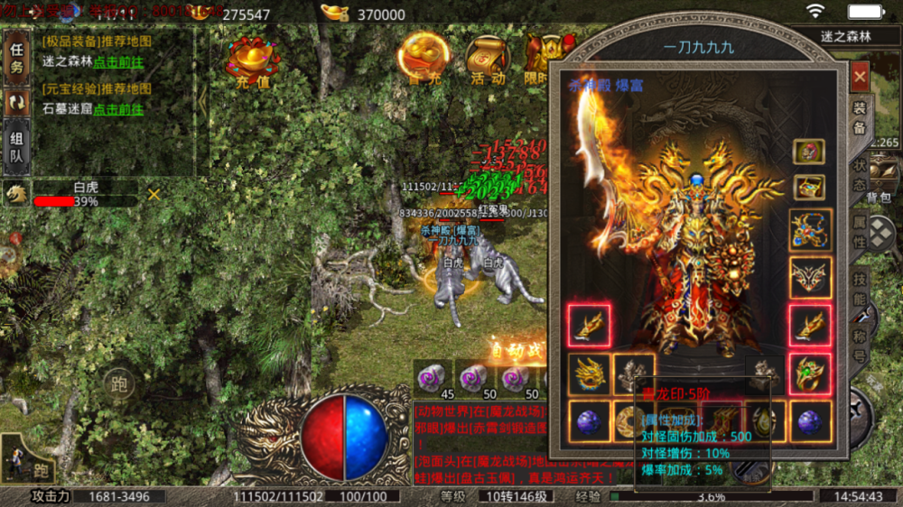 除此之外还有一对极品金手镯,一只加6点攻击,一只加5点攻击,总计加了11点攻击属性,都抵得上一把武器的属性加成了。